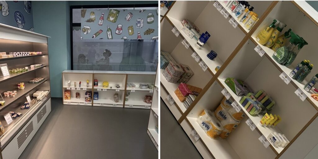 Jeder bekam einen Geldbeutel mit Spielgeld und einen Einkaufzettel. Am Schluss mussten sie an die Kasse. Abwechselnd durften sie Kassierer spielen und mussten auf der Preisliste die Preise in die Kasse tippen. Und so auch das richtige Wechselgeld rausgeben. Danach wurde es schwieriger, denn man durfte auch Pfandflaschen in einen Automaten schmeißen, so wurde die Rechnung an der Kasse schwieriger weil man auch Minus rechnen musste.