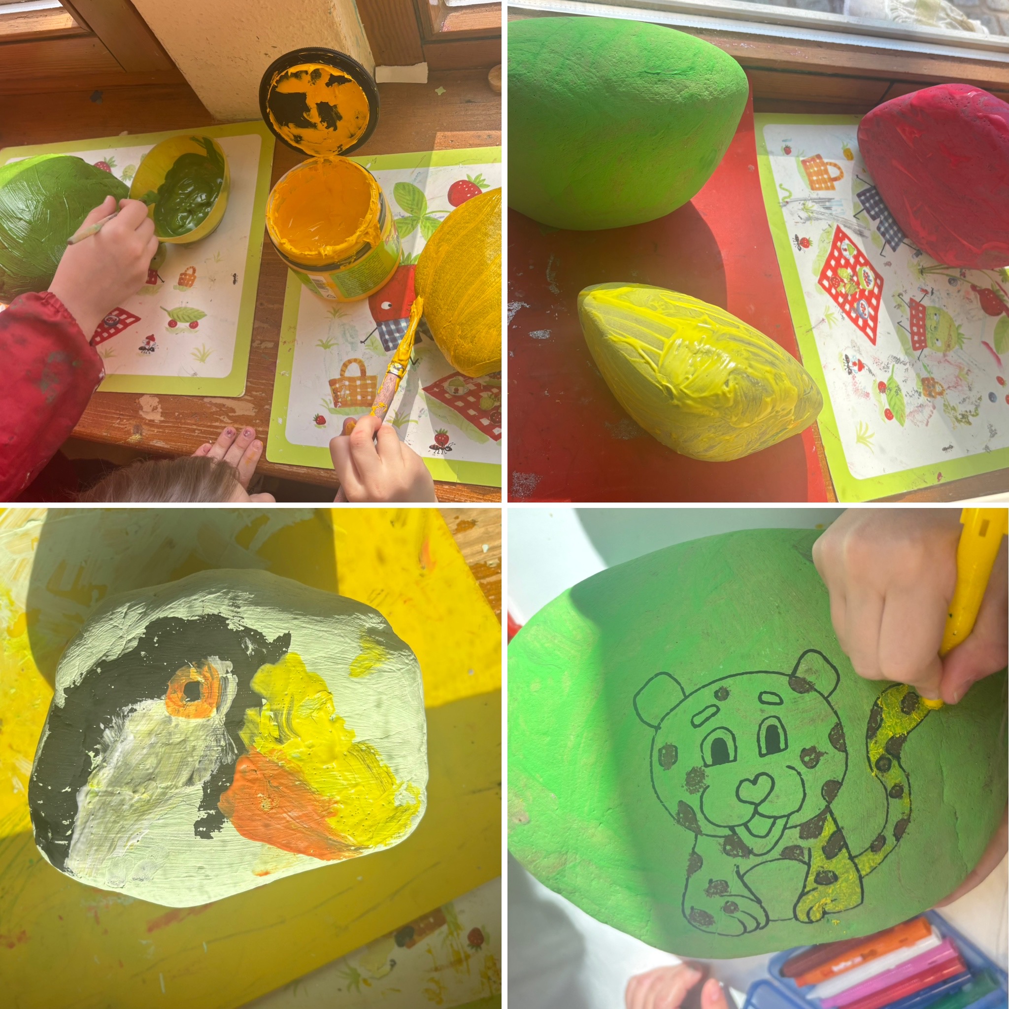 Die Kinder bemalen gerade riesige Steine aus unserem Garten, damit der Garten perfekt zum Frühling kunterbunt wird.