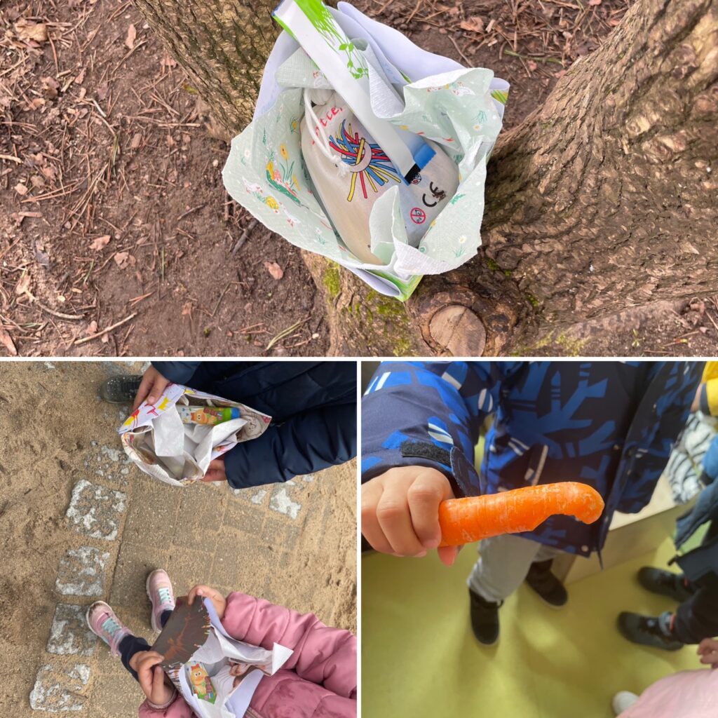 Es war soweit nach dem Osterfrühstück haben sich alle Kinder in der Turnhalle getroffen, und es gab, das Buch Herr Hase und der ungebetene Gast als Bilderbuchkino.Als das Kino fertig war, entdeckten die Kinder in der gelben Gruppe eine angebissen Karotte (vom Osterhasen?)und sahen von weiten im Garten schon Nester stehen. Alle Kinder haben sich angezogen und sind sofort in den Garten und haben ihr Nest gesucht.
